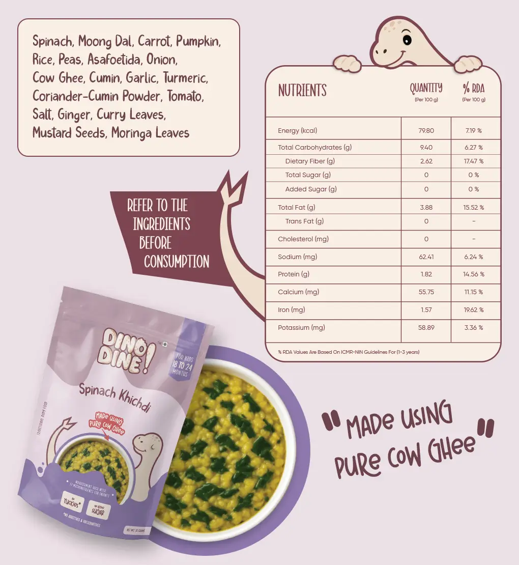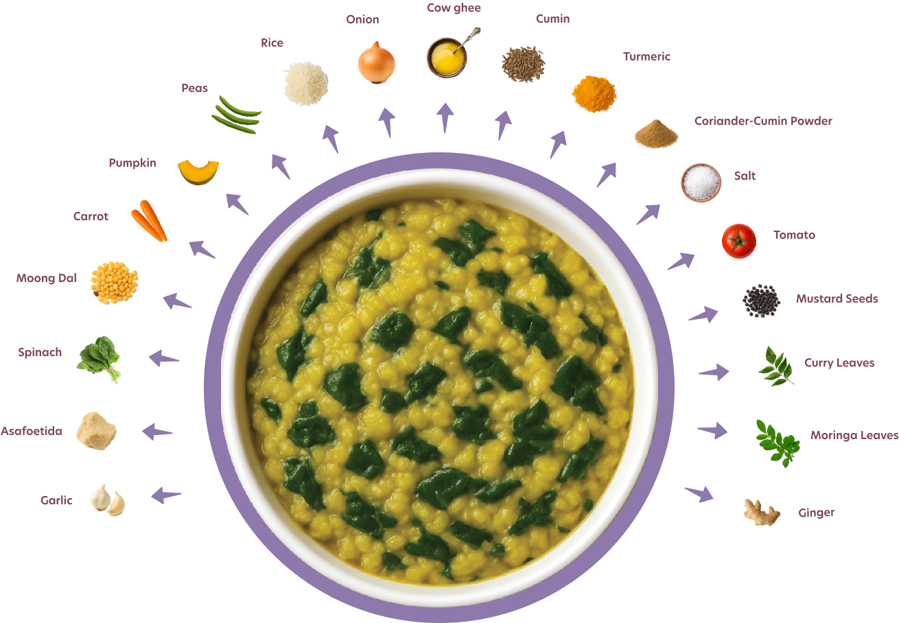 A wholesome blend of rice, dal, and fresh spinach for gentle, balanced nutrition. Light, comforting, and packed with natural goodness.
